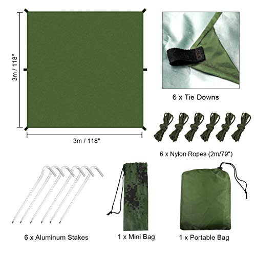 [Ideaal voor meerdere toepassingen]: 3 m x 3 m formaat dat kan voldoen aan uw behoeften voor buitenactiviteiten. Het is een uitstekende onderdak voor uw hangmat, auto, kleding, afgelegen keuken of hond. Ideaal voor kamperen, backpacken, sportevenementen, festivals, picknick en strand