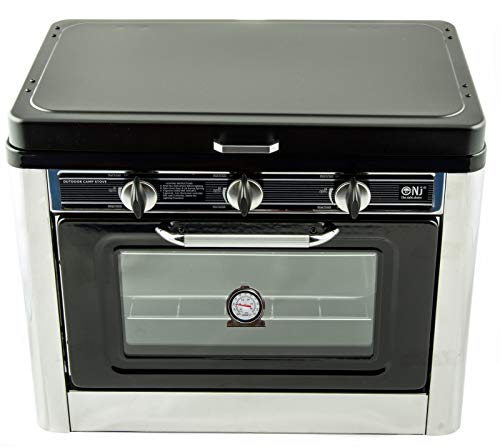 NJ CO-01 Gas-oven-gasfornuis, 2 vlammen, campingkooktoestel met deksel, gasgrill, gasfornuis, oven + gasslangregelaarset